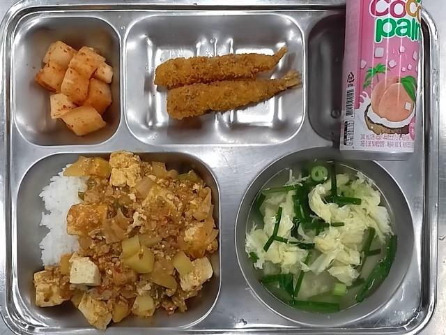 석식: 마파두부덮밥, 계란부추국, 헐소박새우튀김, 깍두기, 코코팜