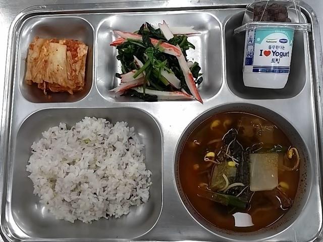 조식: 현미찹쌀밥, 쇠고기해장국, 시금치맛살무침, 배추김치, 아이러브요거트토핑