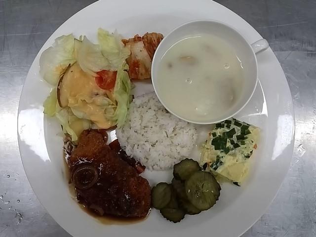 중식: 현미찹쌀밥, 버섯스프, 등심치즈돈까스, 사과양상추샐러드, 오이피클, 배추김치