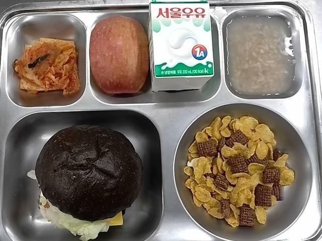 조식: 수제갈비살햄치즈블랙버거, 시리얼+우유, 사과, 숭늉, 배추김치