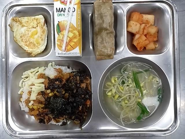 석식: 참치김치덮밥, 무콩나물국, 불고기메밀전병, 깍두기, 델몬트망고주스