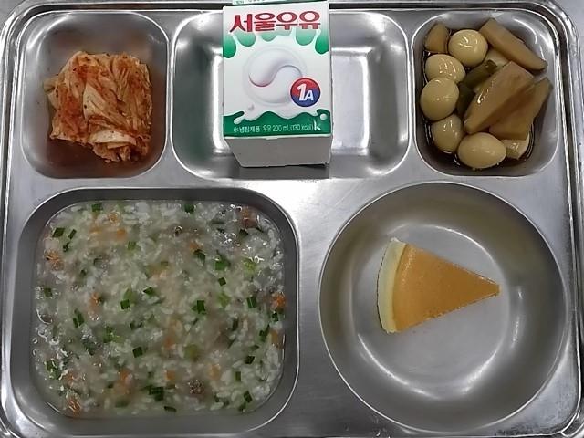 조식: 쇠고기야채죽, 새송이메추리알조림, 배추김치, 치즈케익, 우유