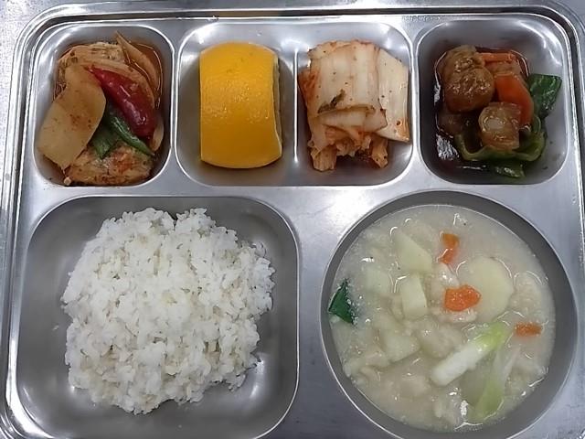 중식: 현미찹쌀밥, 들깨수제비국, 갈치무조림, 함박소스새싹미트볼, 배추김치, 오렌지