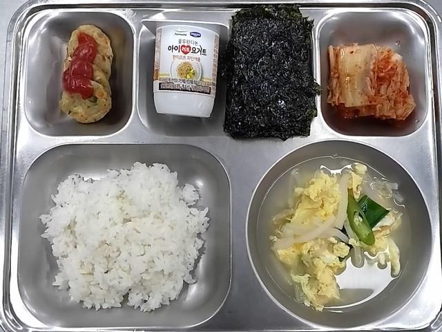 조식: 현미찹쌀밥, 북어무국, 우리콩두부동그랑땡, 구이김, 배추김치, 아이러브요거트