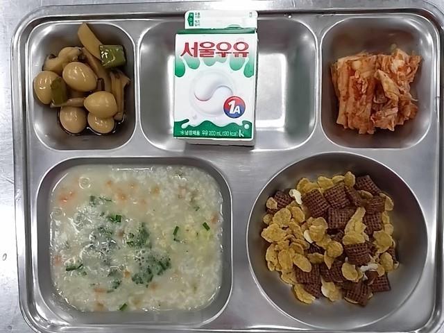 조식: 전복죽, 새송이메추리알조림, 시리얼+우유, 배추김치