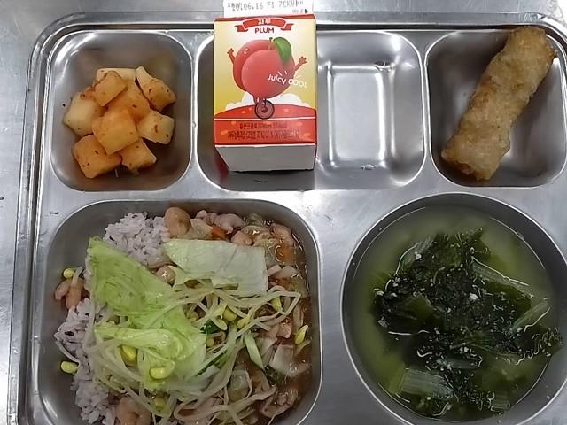 석식: 해물볶음덮밥, 콩가루배추국, 맘스프링롤짜조, 깍두기, 쥬시쿨
