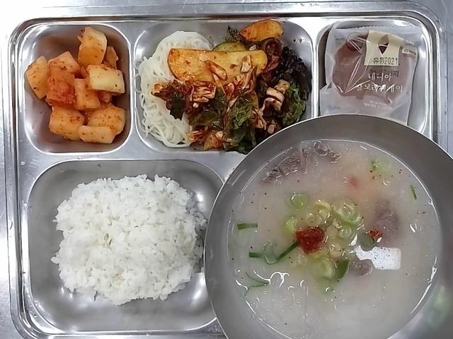 중식: 현미찹쌀밥, 설렁탕, 골뱅이무침+소면, 깍두기, 찰보리팬케익