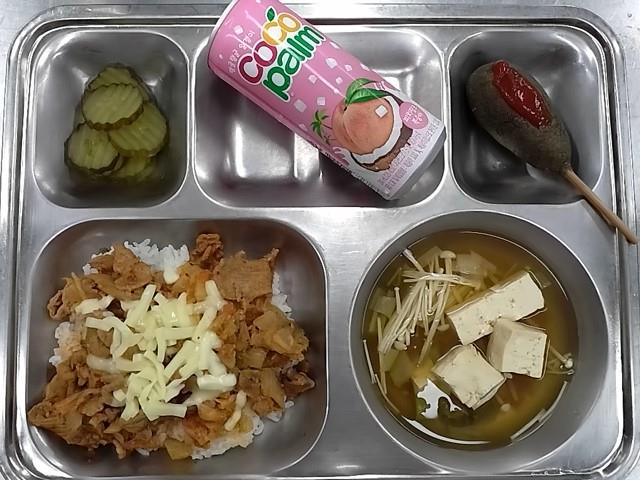 석식: 돈육김치치즈덮밥, 미소된장국, 오이피클, 스위트핫도그, 코코팜