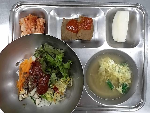 중식: 전주비빔밥, 달걀파국, 떡갈비+소스, 배추김치, 참외