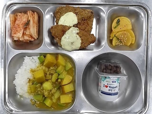 조식: 바몬드카레라이스, 통살참치까스+소스, 단무짐무침, 배추김치, 아이러브요거트