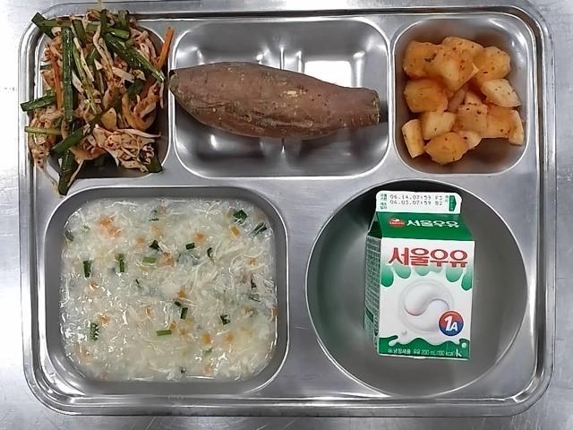 조식: 영양닭죽, 양배추부추무침, 깍두기, 군고구마, 우유