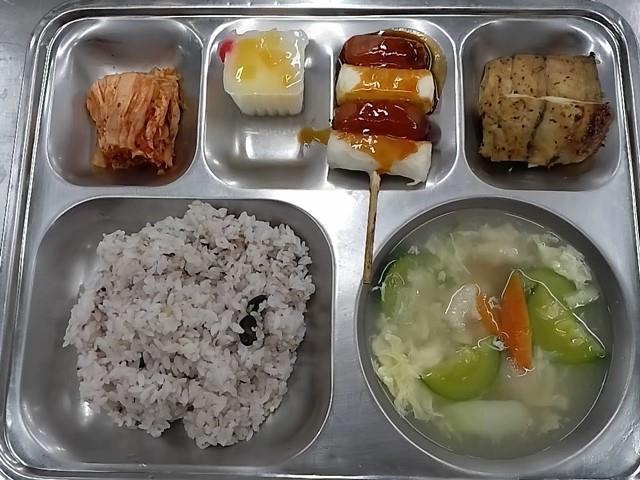 석식: 혼합잡곡밥, 감자수제비국, 삼치데리야끼구이, 소떡소떡, 배추김치, 요거트푸딩