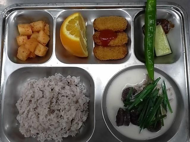 중식: 혼합잡곡밥, 신의주전통순대국, 아삭이고추+오이+쌈장, 허니버터감자고로케, 깍두기, 오렌지