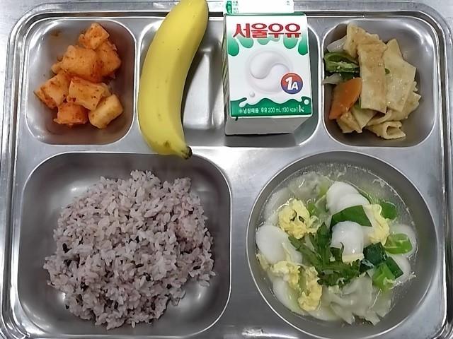 조식: 혼합잡곡밥, 떡만두국, 어묵볶음, 깍두기, 바나나, 우유