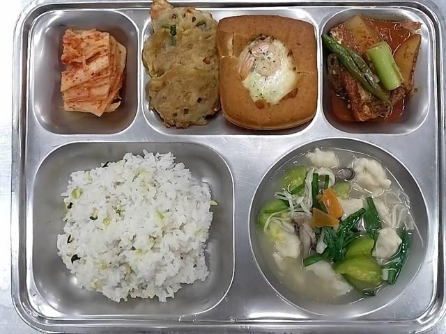 중식: 서리태밥, 버섯수제비국, 고등어무조림, 연근전, 배추김치, 콤비네이션피자