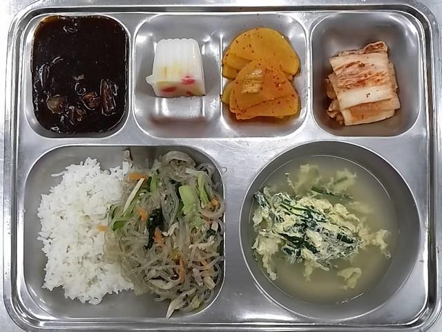 석식: 잡채덮밥+자장소스, 계란부추국, 단무지무침, 배추김치, 요거트푸딩