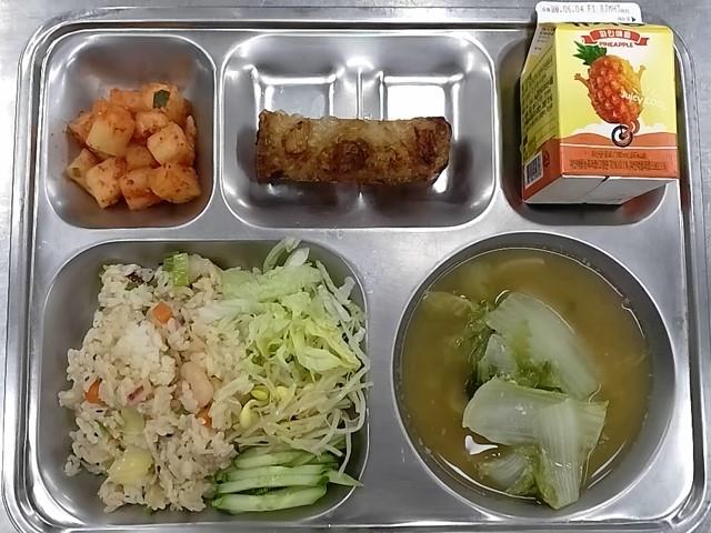 석식: 해물볶음덮밥, 콩가루배추국, 깍두기, 롤 짜조, 쥬시쿨