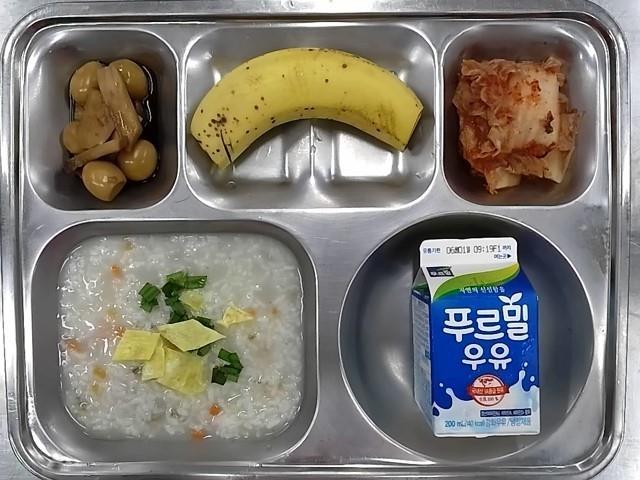 조식: 전복죽, 새송이메추리알조림, 배추김치, 바나나, 우유