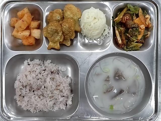 중식: 현미찹쌀밥, 설렁탕, 골뱅이무침+소면, 깍두기, 슈크림붕어빵