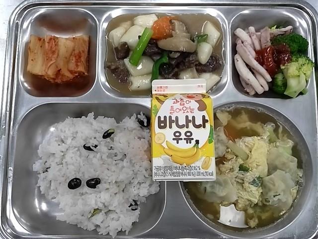 석식: 서리태밥, 꼬맹이만두국, 궁중떡볶이, 오징어브로코리 숙회, 배추김치, 바나나우유