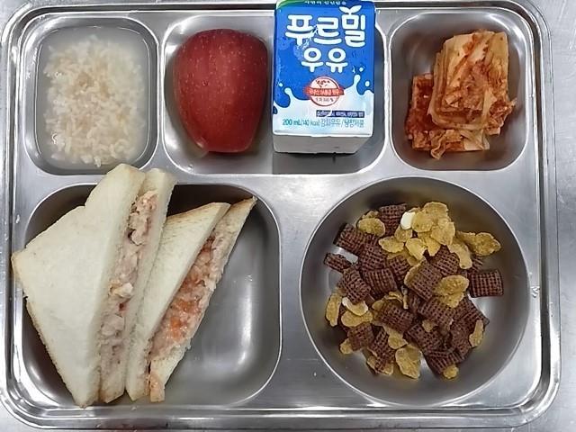 조식: 참치샌드위치, 시리얼+우유, 사과, 숭늉, 배추김치