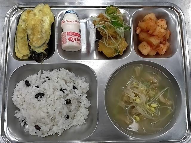 중식: 서리태밥, 북어채콩나물국, 파닭순살치킨, 가지전, 깍두기, 요구르트