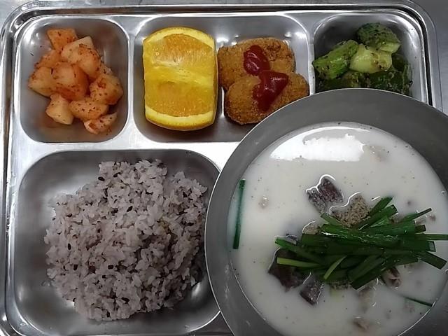 중식: 혼합잡곡밥, 신의주전통순대국, 아삭이고추+오이 된장무침, 허니버터감자고로케, 깍두기, 오렌지