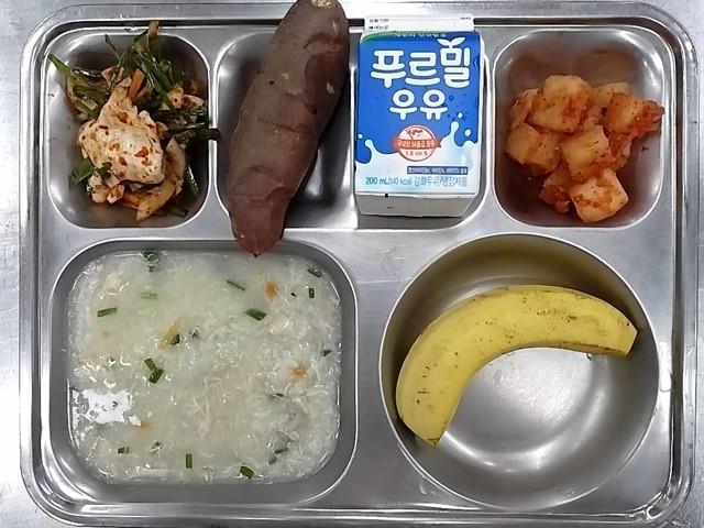 조식: 영양닭죽, 양배추부추무침, 깍두기, 군고구마, 바나나, 우유