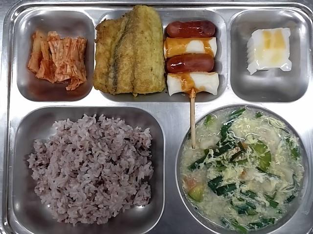 석식: 혼합잡곡밥, 감자수제비국, 삼치데리야끼구이, 소떡소떡, 배추김치, 요거트푸딩