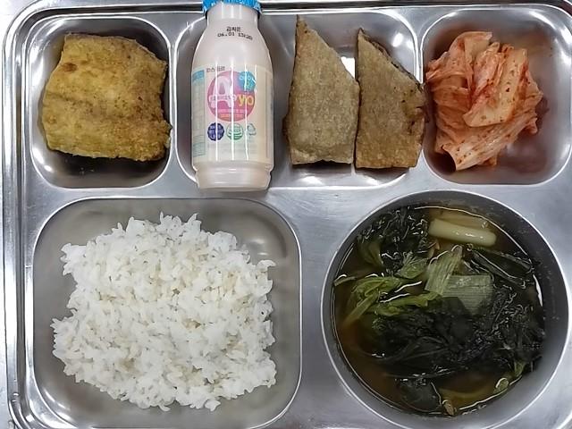 저녁: 현미찹쌀밥, 건새우아욱된장국, 고등어순살구이, 불고기메밀전병, 배추김치, AYO요구르트