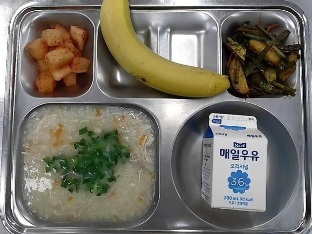 조식: 영양닭죽, 오이부추무침, 깍두기, 바나나, 우유