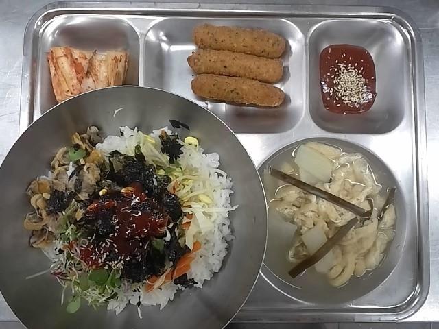 중식: 꼬막비빔밥, 유부다시마국, 고구마치즈롤, 배추김치