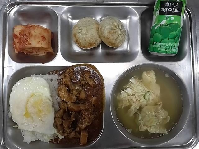석식: 찜닭덮밥+계란후라이, 탕파국, 보름달군만두, 배추김치, 망고음료