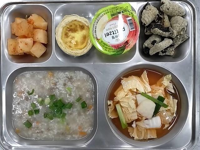 조식: 쇠고기야채죽, 나박김치, 김부각, 깍두기, 에그타르트, 쁘띠첼