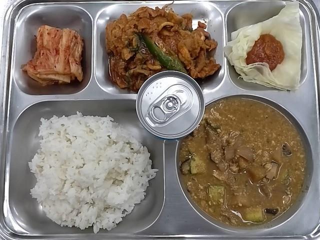 석식: 발아현미밥, 호박버섯강된장, 오삼불고기, 양배추쌈+쌈장, 배추김치, 오렌지쥬스