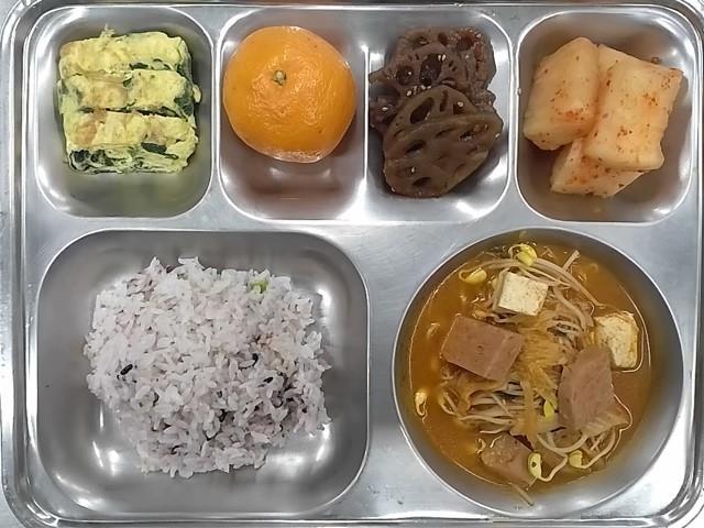 조식: 혼합잡곡밥, 부대찌개, 연근조림, 시금치계란말이, 석박지, 귤