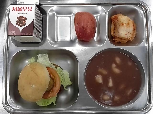 조식: 동지팥죽, 배추김치, 불고기버거, 사과, 초코우유,