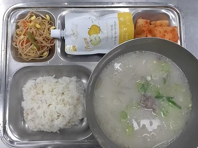 석식: 현미찹쌀밥, 설렁탕+당면사리, 콩나물무침, 석박지, 친환경배쥬스