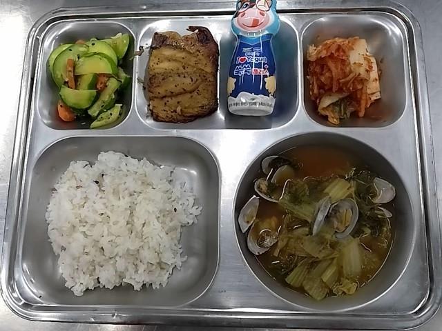 조식: 현미찹쌀밥, 바지락단배추국, 호박나물, 삼치데리야끼구이, 배추김치, 요플레