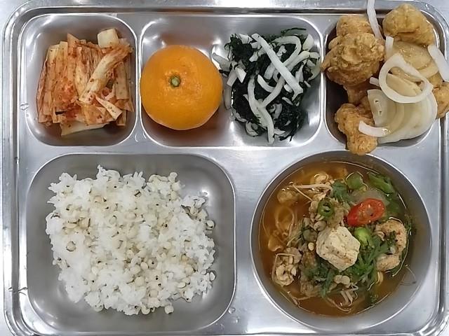 중식: 율무밥, 대구알탕, 파닭순살치킨, 무파래초무침, 배추김치, 귤