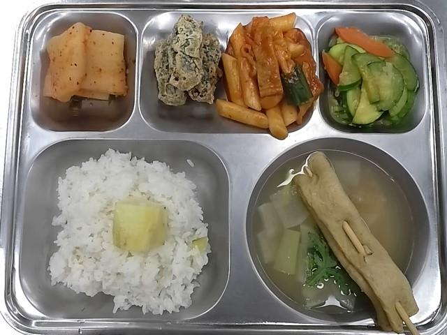 석식: 고구마밥, 꼬치어묵국, 떡볶이+김말이, 호박새우젓볶음, 석박지