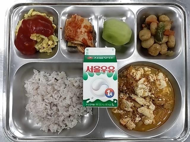 조식: 백미밥, 순두부찌개, 우엉어묵양파볶음, 양송이스크램블+소스, 배추김치, 키위,우유