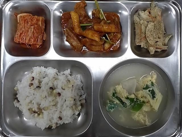 중식: 찰옥수수밥, 북어계란국, 매운갈비떡찜, 새송이들깨볶음, 배추김치