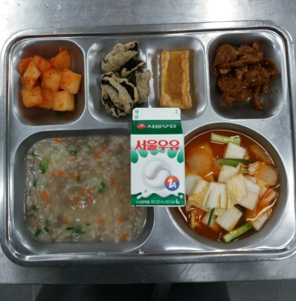 조식: 쇠고기야채죽, 나박김치, 오복채무침, 김부각, 깍두기, 애플파이, 우유