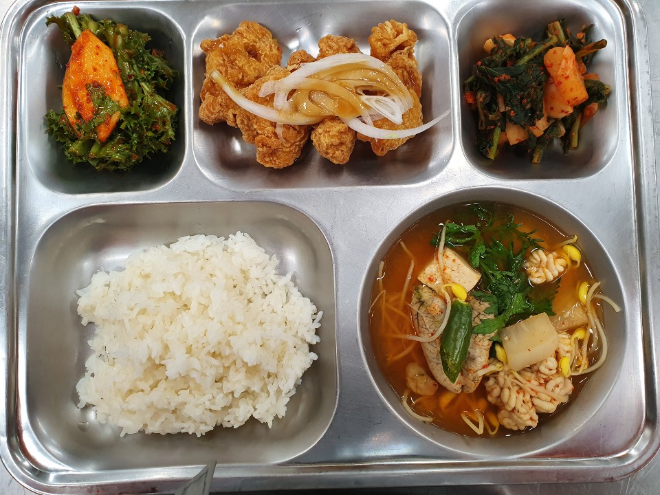중식: 백미밥, 대구알탕, 파닭순살치킨, 치커리사과무침, 총각김치
