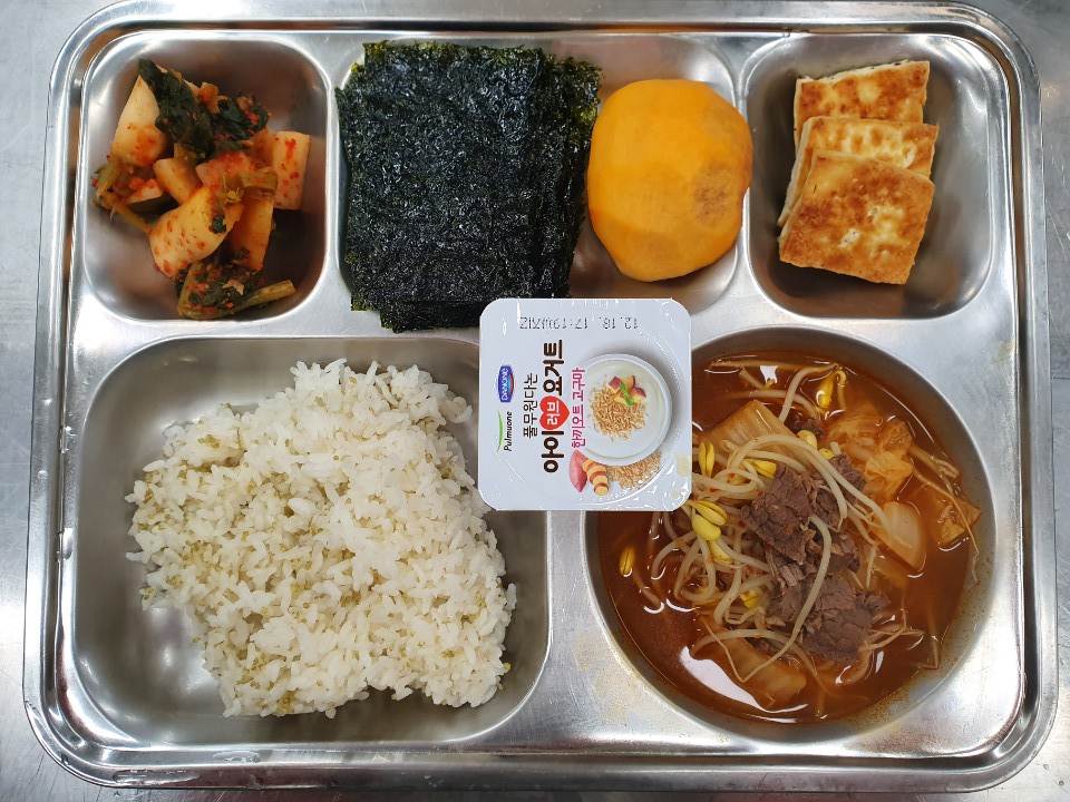 조식: 차조밥, 쇠고기우거지국, 두부구이+양념장, 구이김, 총각김치, 단감, 생크림요거트