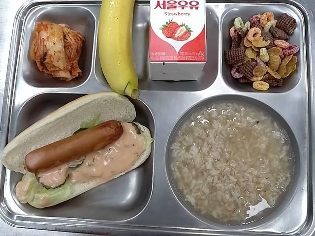 조식: 핫도그빵, 시리얼, 딸기우유, 바나나, 숭늉+배추김치