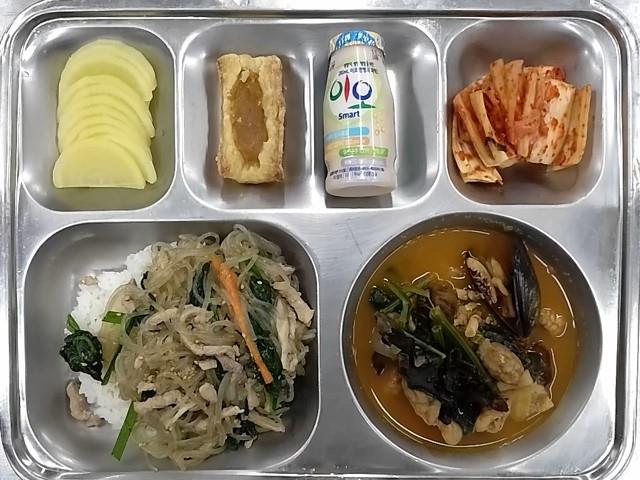 석식: 잡채덮밥+간장, 짬뽕국, 백색단무지, 배추김치, 애플파이, 이오