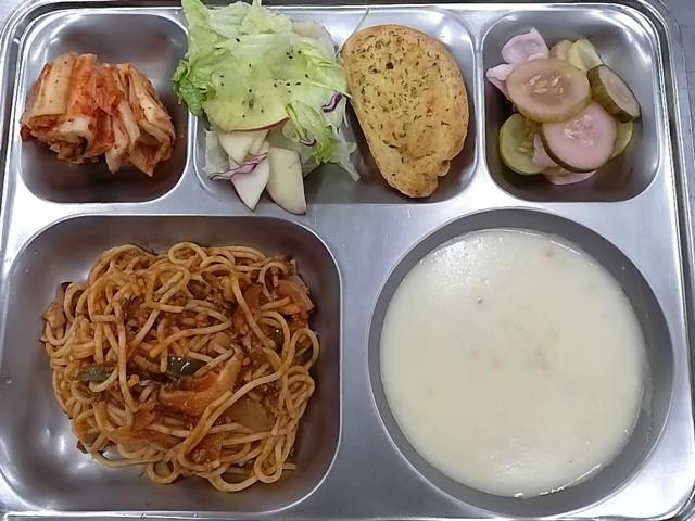 중식: 미트스파게티, 야채크림스프, 야채과일샐럿+키위소스, 마늘빵, 야채아삭피클, 배추김치