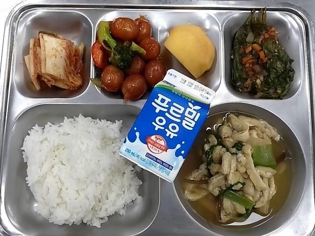 조식: 백미밥, 유부다시마국, 깻잎찜, 비엔나칠리소스볶음, 배추김치, 단감, 우유